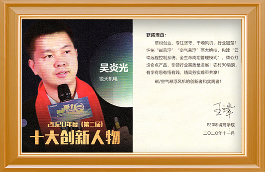 1、雷茨總經理吳炎光榮獲環境商學院2020屆“十大創新人物”,傾心打造奇點產品“空氣懸浮風機”和“磁懸浮風機”;
